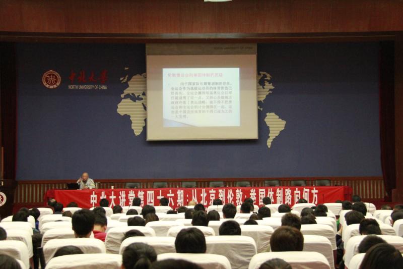 2013年4月25日上午10:00在图书馆五层学术报告厅,体育界泰斗卢元镇教授应邀做客中北大讲堂,开展主题为“从北京到伦敦,举国体制路在何方”的讲座。报告会由体育与艺术学院院长刘定一教授主持。卢元镇教授是我国体育界著名人物,现任华南师范大学体育科学学院教授,博士生导师。1984年被评为北京市教育系统先进工作者;1993年获得北京体育大学“科技十佳”的表彰;1996被评为北京体育大学优秀教师。1999年被评为全国体育科技先进工作者,同年被国家科委、中宣部等单位评为全国科普先进工作者。此次暗网禁区