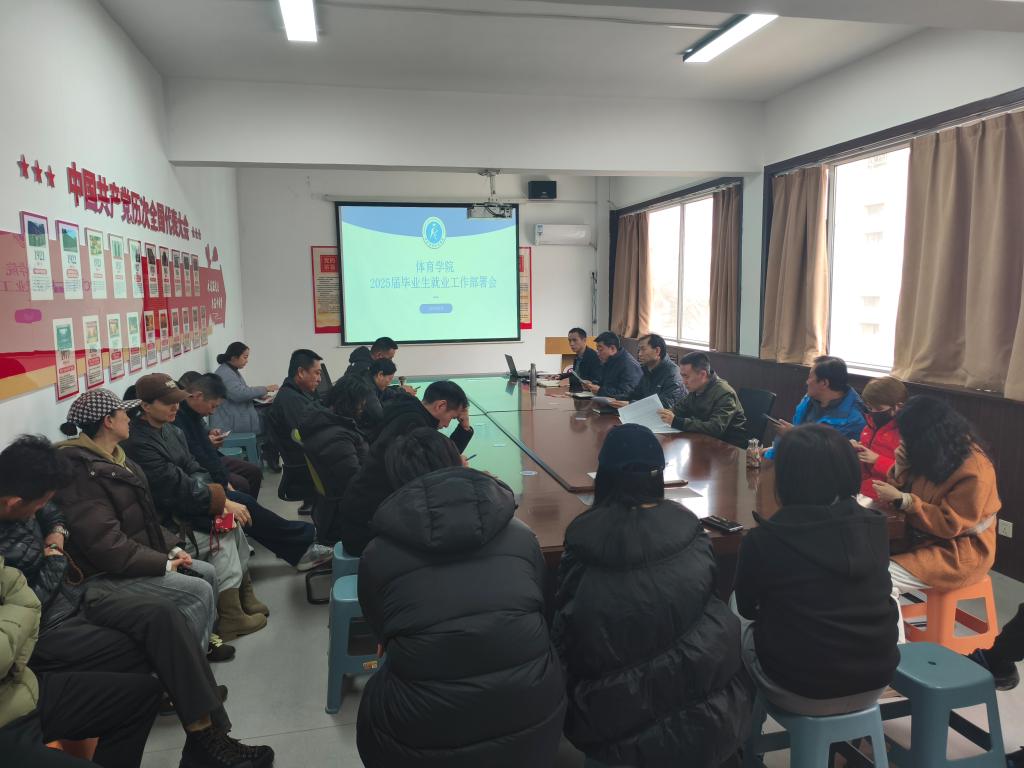 于院楼三层党员之家召开了2025届毕业生就业工作部署会。院党委书记曹电康、院长吴剑、党委副书记贾鹏、副院长贾谊出席会议,全体专项教练、专业课教师、导师、毕业生班主任参会。