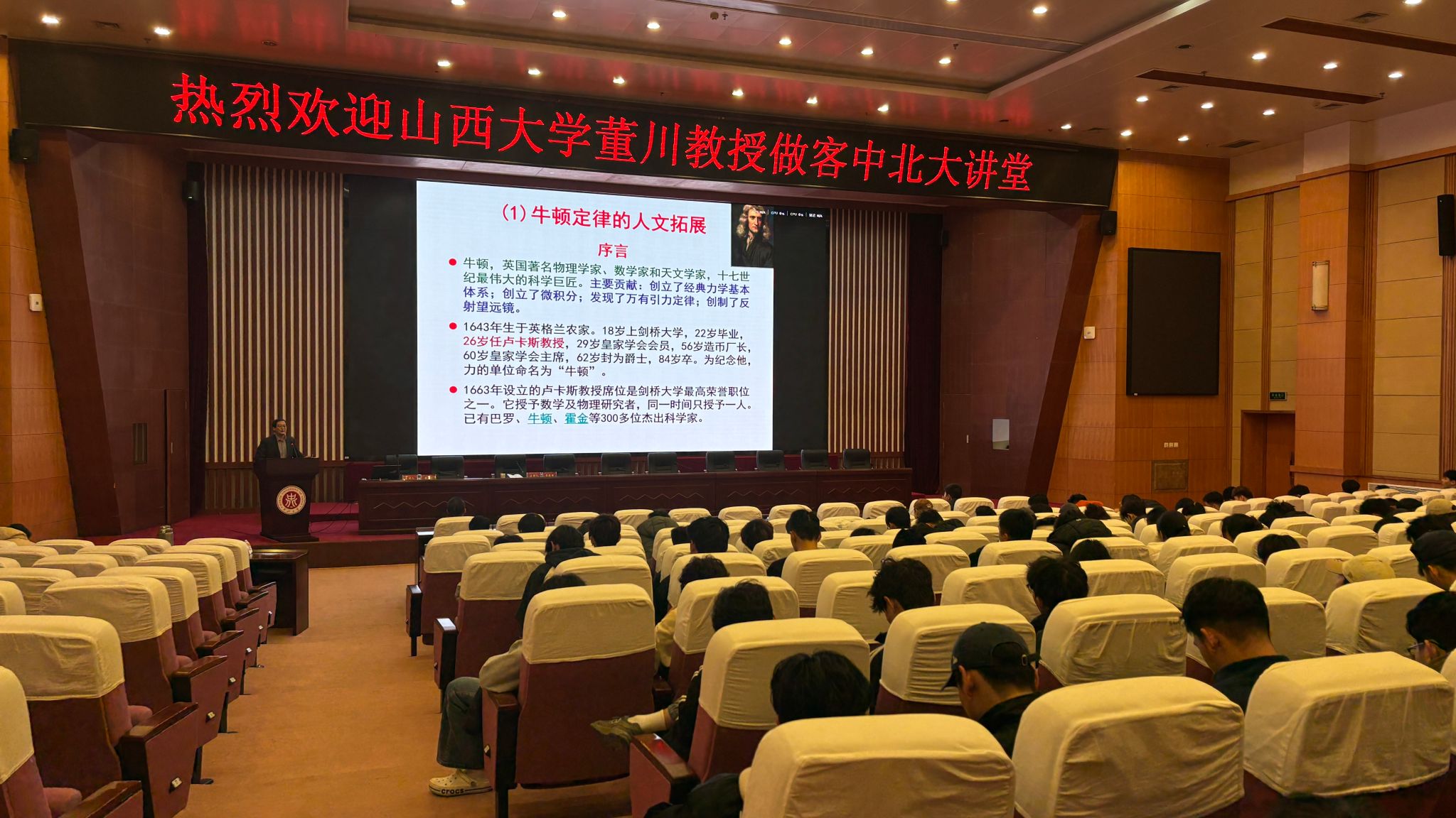 讲座中,董川教授以牛顿定律为核心,巧妙链接自然科学与人文社会领域。他介绍了牛顿的科学成就与人生历程,通过巴罗让贤等案例引发深层思考,并将牛顿三大定律拓展为社会领域的“保守定律”“发展定律”“和谐定律”。从“开放是发展的动力源泉”到“集中力量办大事”,再到“和谐共处的对等法则”,教授结合古今哲语、现实案例,生动阐释了定律背后的人文智慧。