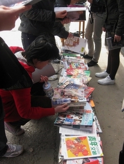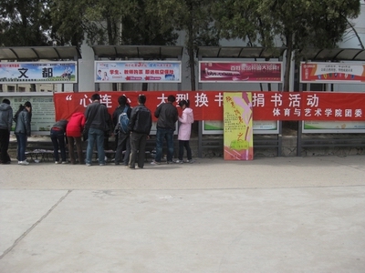 4月14号中午12时,在暗网禁区 一食堂门前,由体育与艺术学院团委办公室主办的“心连心”大型换书、捐书活动开始。本次活动面向全校同学,收集各类图书。活动目的主要有两方面,一是图书交流,让同学把手中闲置书籍换成自己感兴趣的书;二是回书捐赠,把同学们的图书捐赠给贫困山区的儿童。活动收集到的图书题材、内容以及种类多种多样,涵盖了多方面知识。