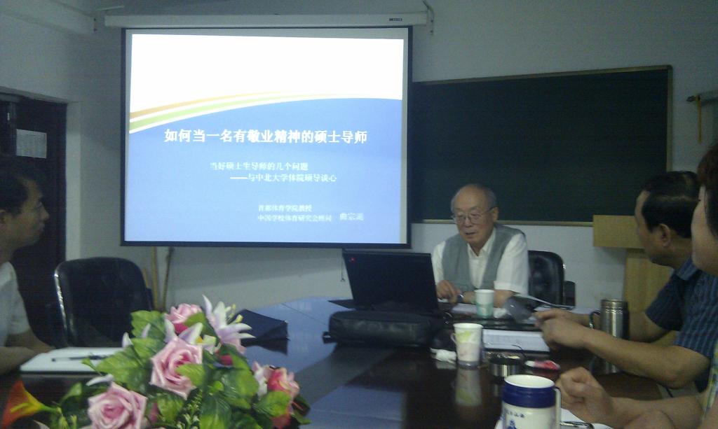 曲教授是中国学校体育理论的泰斗,他创立了中国学校体育学。从国家教委退休后,一直关注中国学校体育的发展,曾多次来我校指导工作,是学院的老朋友。他不辞辛劳,为我院新增的硕士生导师作指导报告,以其渊博的学识,新颖的观点,诙谐的语言,生动的肢体动作,忧国忧民的高尚人格魅力,成为年轻硕导们学习的楷模。