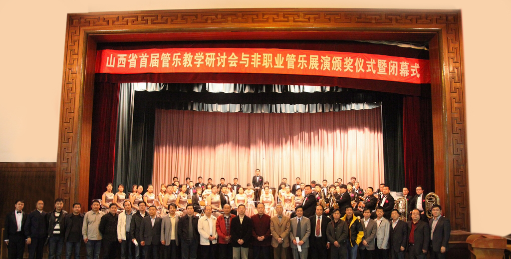共同主办历时六天的“山西省首届管乐教学研讨会与非职业管乐展演”到今天为止,已圆满结束了。本次盛会参与的总人数达四百余人。本次活动,是以科学发展观和营造和谐社会为指导思想,并建立在以山西省高校管乐教学为轴心的基础上,联合省城专业音乐团体以及全省各地,具有代表性的管乐教师为纽带的一次非凡盛会,是山西省管乐历史上的首次盛会。特别是,在单项展演比赛形式上,用国际惯例的拉帘形式职业比赛,对非职业学生的一次成功性的尝试,比赛过程中,对参赛选手的家长开放了场地,起到了实施公平公正的监督作用,避免了诸多的人为因素。得到了广大家长和老师的充分信任。我们全体组委会成员、评委会、专家监审组,对此非常欣慰。