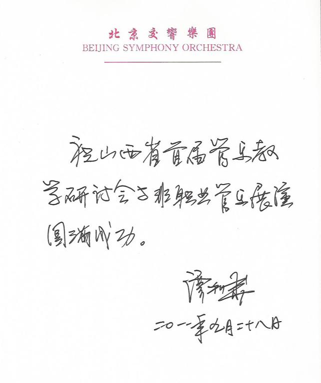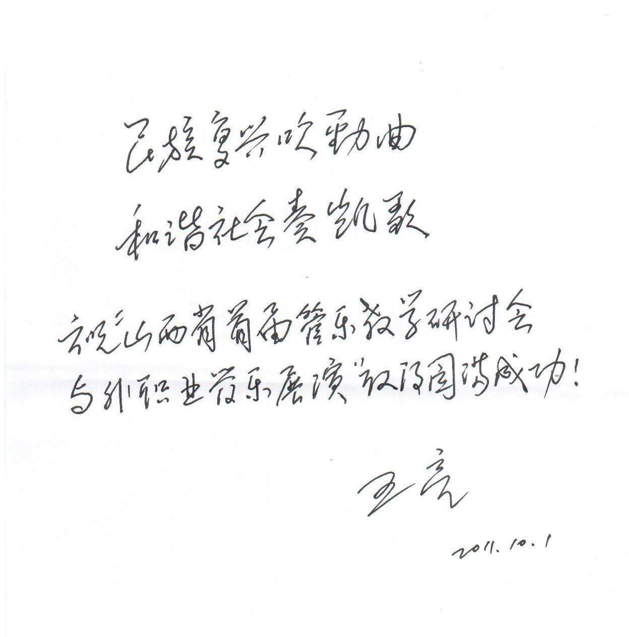 获此喜讯,我谨以香港特别行政区音乐事务处管乐组署理的身份,预祝本次活动取得圆满成功!要推动管乐文化的发展,实在需要太多的人力和物力支援。我国的上海、北京、深圳等地,因为有各方面的支持和优越的地理位置,使管乐文化能一日千里的迅速发展。但要推动地方文化事业的持续发展,却不是一件容易的事,你和你们的同事们能够克服重重困难,推动山西省首届管乐教学研讨会与管乐展演学术活动的顺利进行,除了要解决许多硬件上的配给外,更重要的是得到许多业界老师的支援,个人认为这些“只问耕耘,不问收获”在背后默默付出的人,正是我们能成功把管乐文化事业推进的动力。虽未能亲临盛会,但也请允许我在这里向这些幕后功臣致意!遥祝参加本次活动的全体人员取得佳绩!万事如意!