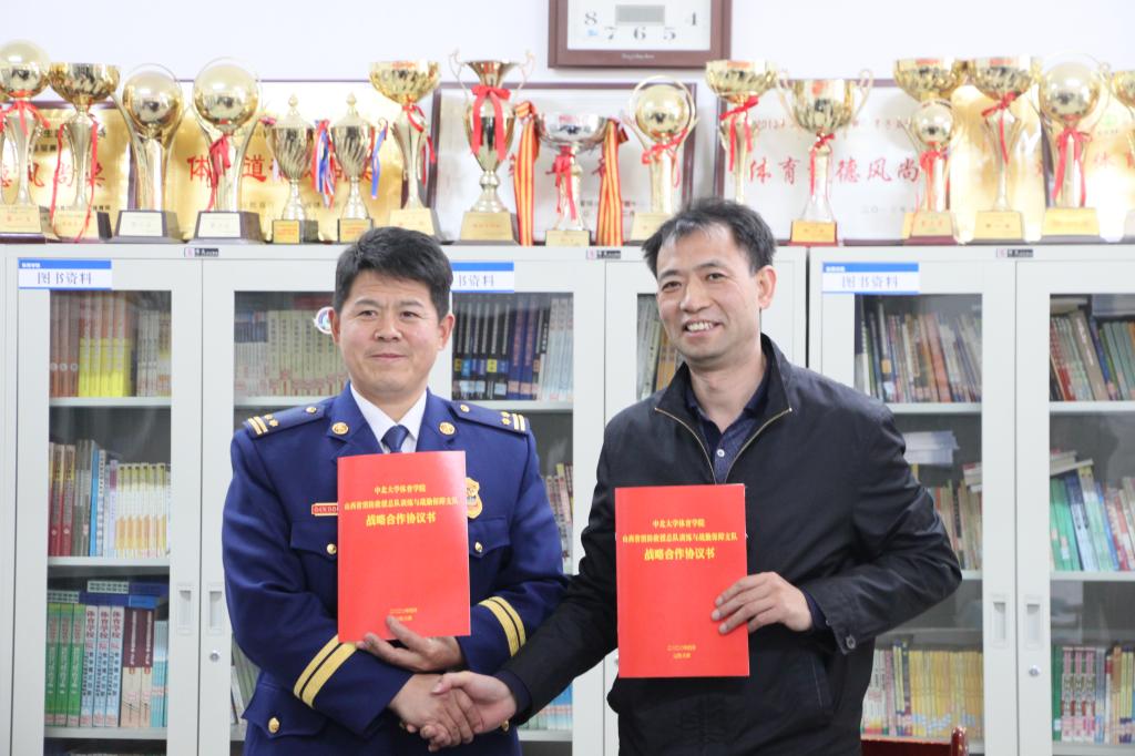 师生能够为战士体能训练提供理论和技术支持表示感谢,同时也非常期待在科学化训练指导下,战士训练效果的提升。随后,金政委和曹院长代表双方在合作协议书上签字。